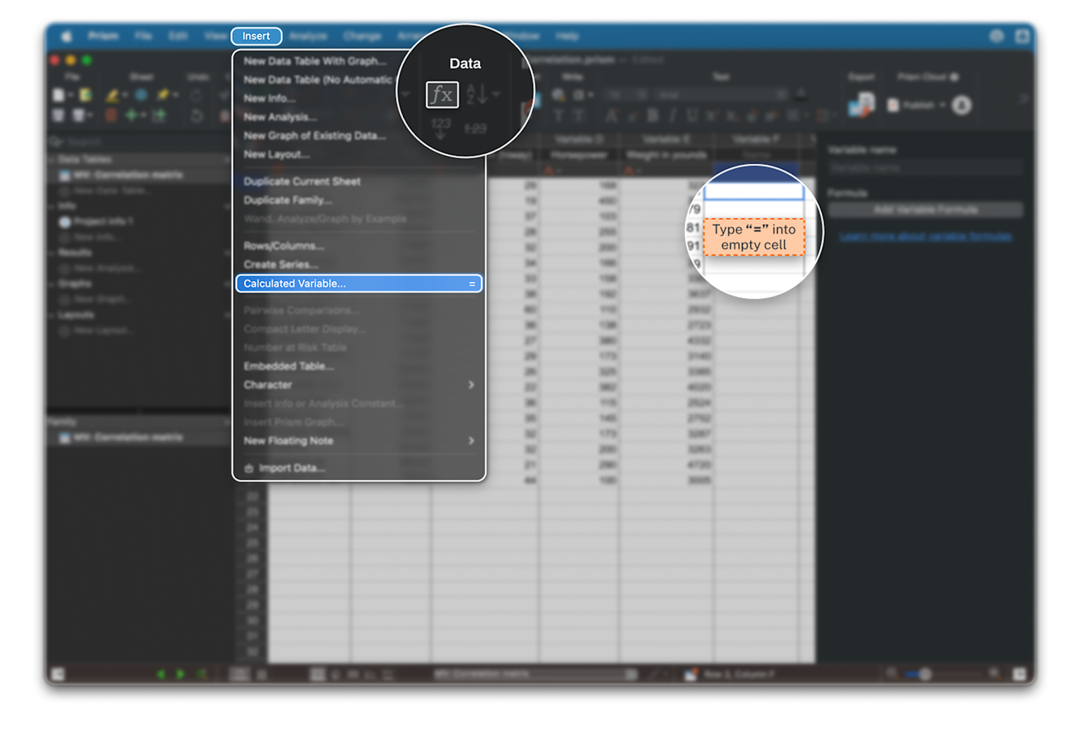 使用电子表格风格的公式直接在多变量表格中创建新变量,包含在 Prism Pro 和 Enterprise 计划中。